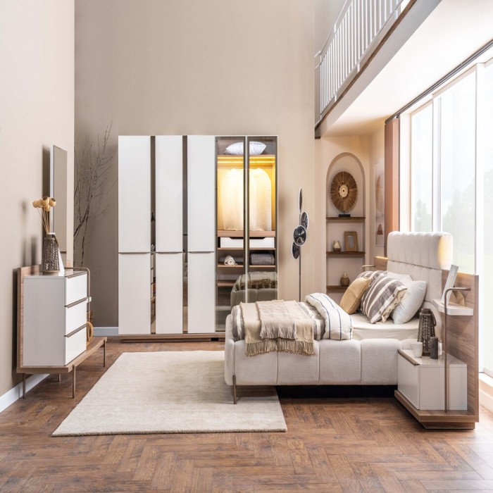 غرفة نوم فاخرة باللون البيج والخشبي 9 قطع – صناعة تركية بتصميم أنيق