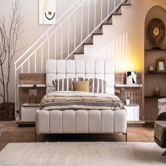 تصميم راقٍ يجمع بين اللون الكريمي والخشبي الدافئ لإضفاء لمسة فاخرة ودافئة على غرفتك.